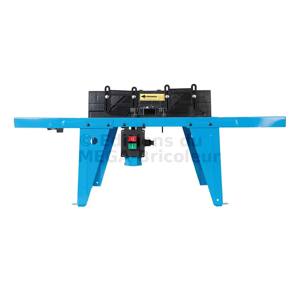- ContenuTable en fonte d'aluminium ; 2 x Rallonges de table ; Manuel d'instructions ; Rapporteur ; Boîtier de commande ; Dispositif de serrage pour gâchette de défonceuse ; Guide principal ; Guide ajustable ; Protection ; 2 x Peignes verticaux ; Peigne horizontal ; Table de défonceuse