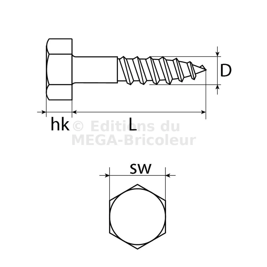 - Type de Vis : Vis à bois hexagonale.