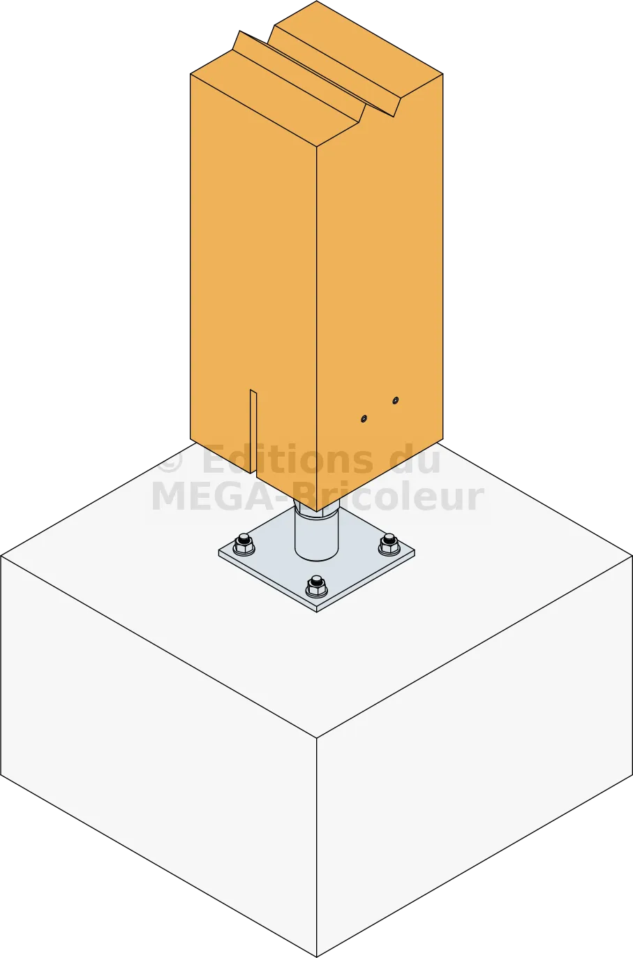 - Protège le poteau bois de l’humidité en le surélevant du sol.