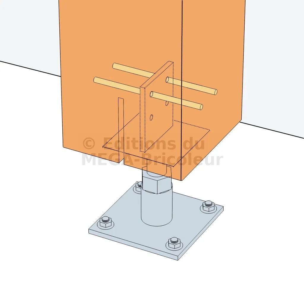 La connexion entre le pied de poteau et le poteau bois s’effectue à l’aide des deux broches supérieures.