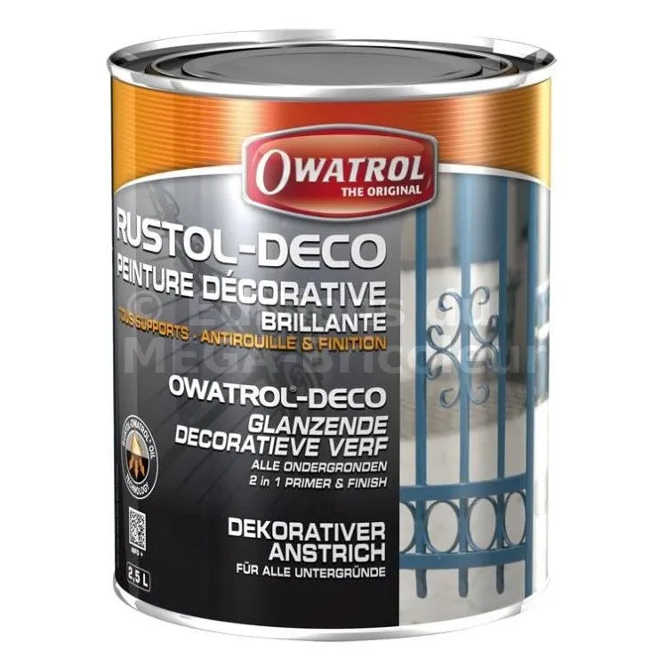 RUSTOL-DÉCO est une peinture antirouille disponible en brillant, mat, satin et également en trois teintes micacées brillant. Ce produit assure une protection antirouille renforcée et décorative sur tous supports.