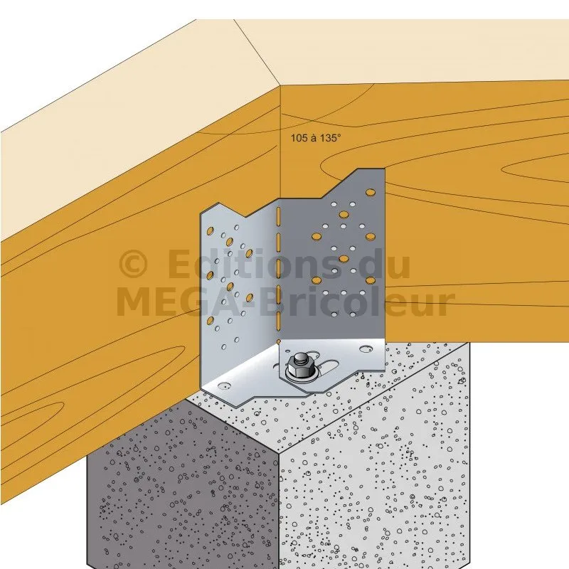 L’équerre réglable pour dalle bois ABF230 permet la fixation de ceinture porteuse de dalle bois sur plot béton. Elle est réglable en angle sur chantier et permet ainsi d’obtenir un angle intérieur entre les poutres bois de 90 à 150°. Des repères visuels sur la pièce permettent un ajustement à l‘angle souhaité.