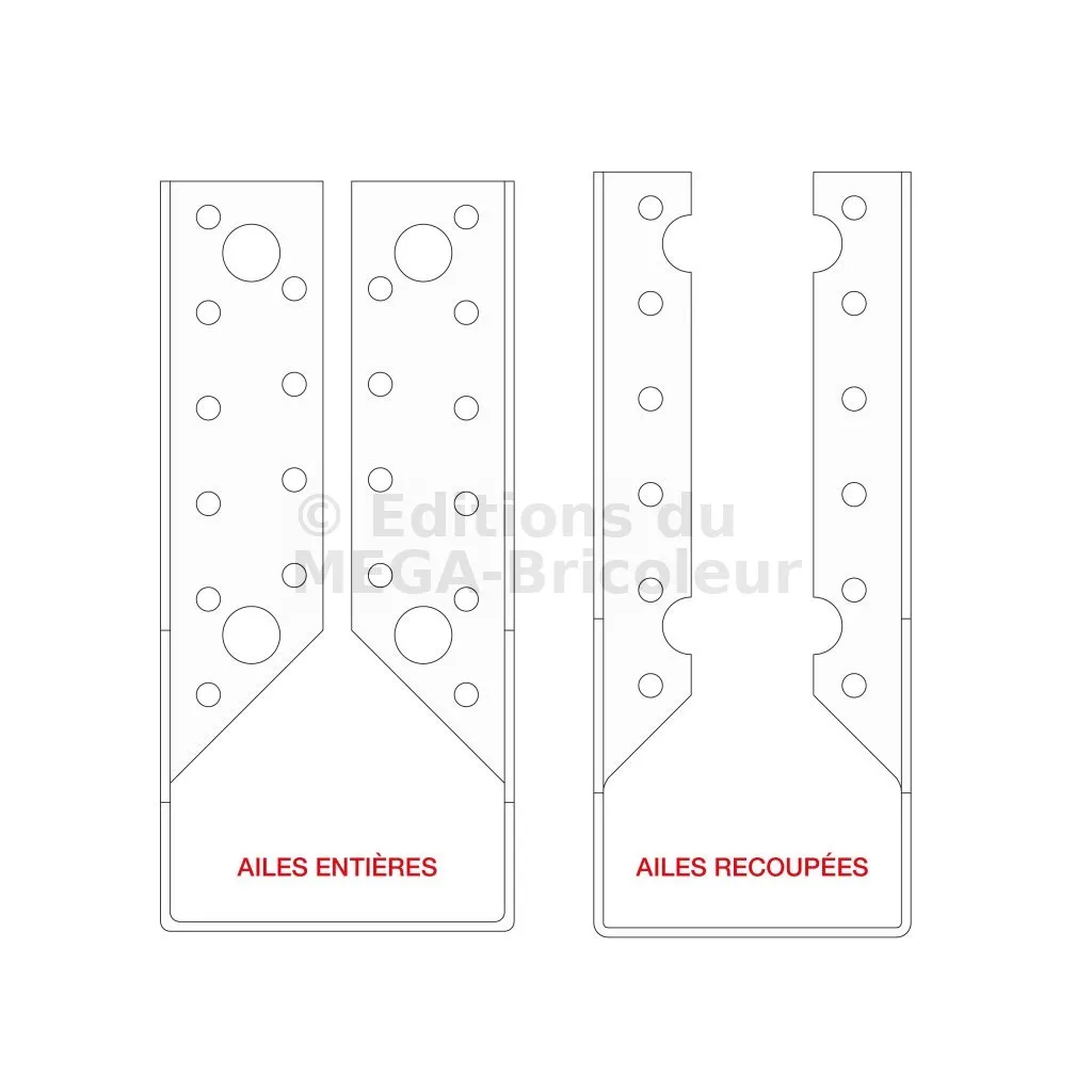 | Références | Développé [mm] | Avec perçages de pointes uniquement (ailes recoupées) | Avec perçages de tirefonds et pointes (ailes entières) |