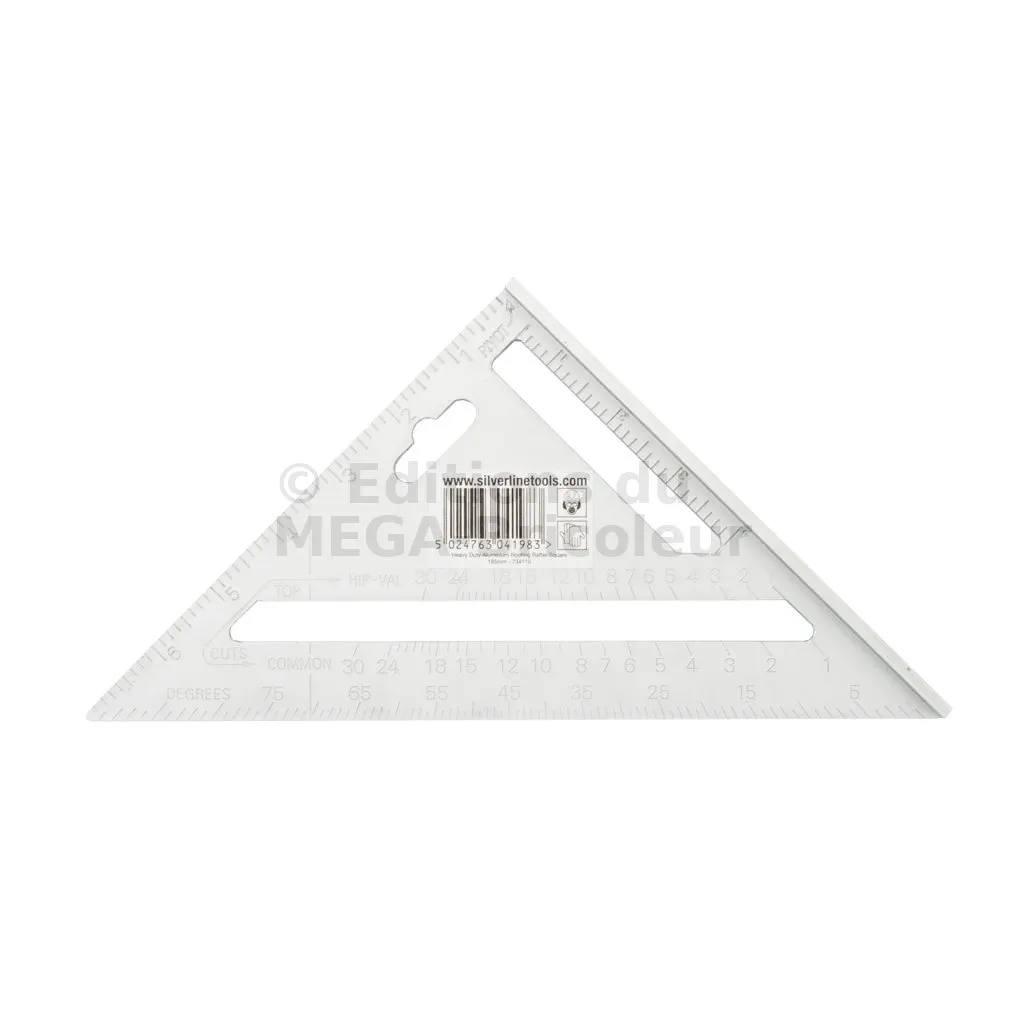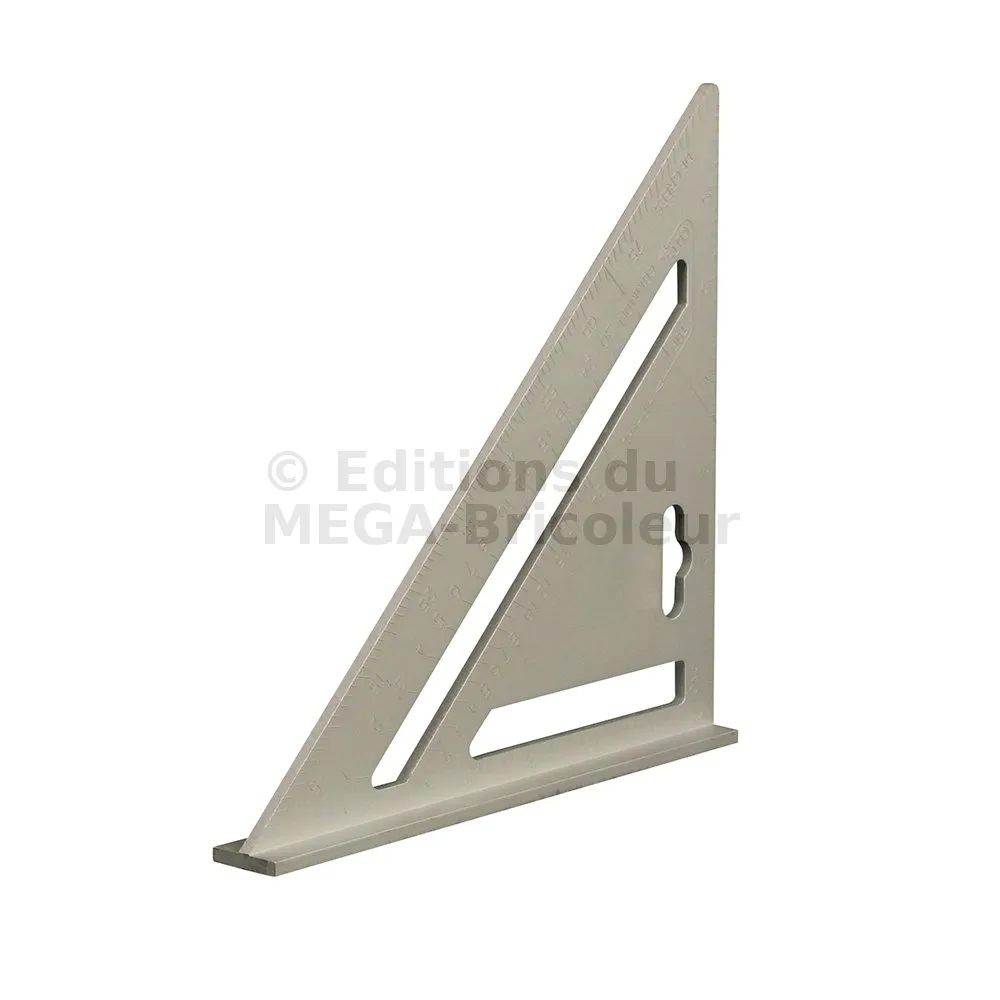 Équerre à corps robuste en alliage d’aluminium moulé, graduations impériales en relief faciles à lire, et table de conversion pour la pose de chevrons. À bords relevés pour une localisation sure. Échelle de rapporteur 0-90°. À utiliser comme guide lors du sciage pour les mesures d’angle et les coupes. Poids 125 g. Dimensions : 185 x 185 x 260 mm.