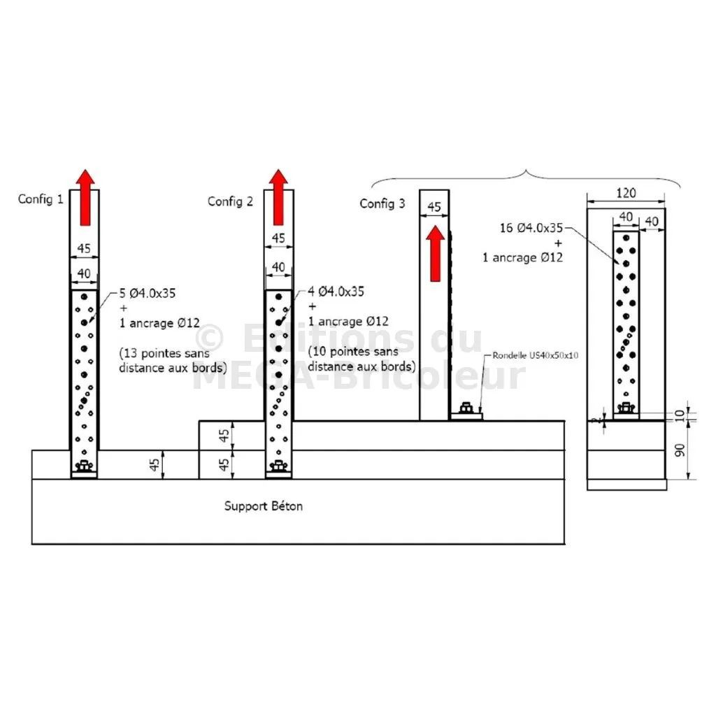 * L’utilisation de pointes Ø4,0x50 dans la configuration 3 n’est possible que si l’épaisseur du montant est supérieure à 50 mm.