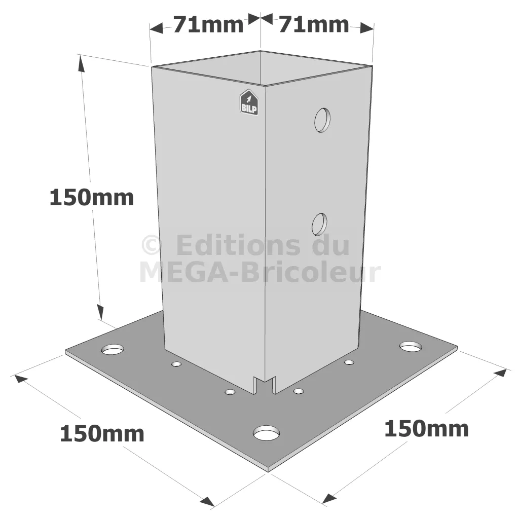 - 1 pied de poteau PPJBT70 ou PPJBT90 en acier galvanisé à chaud,