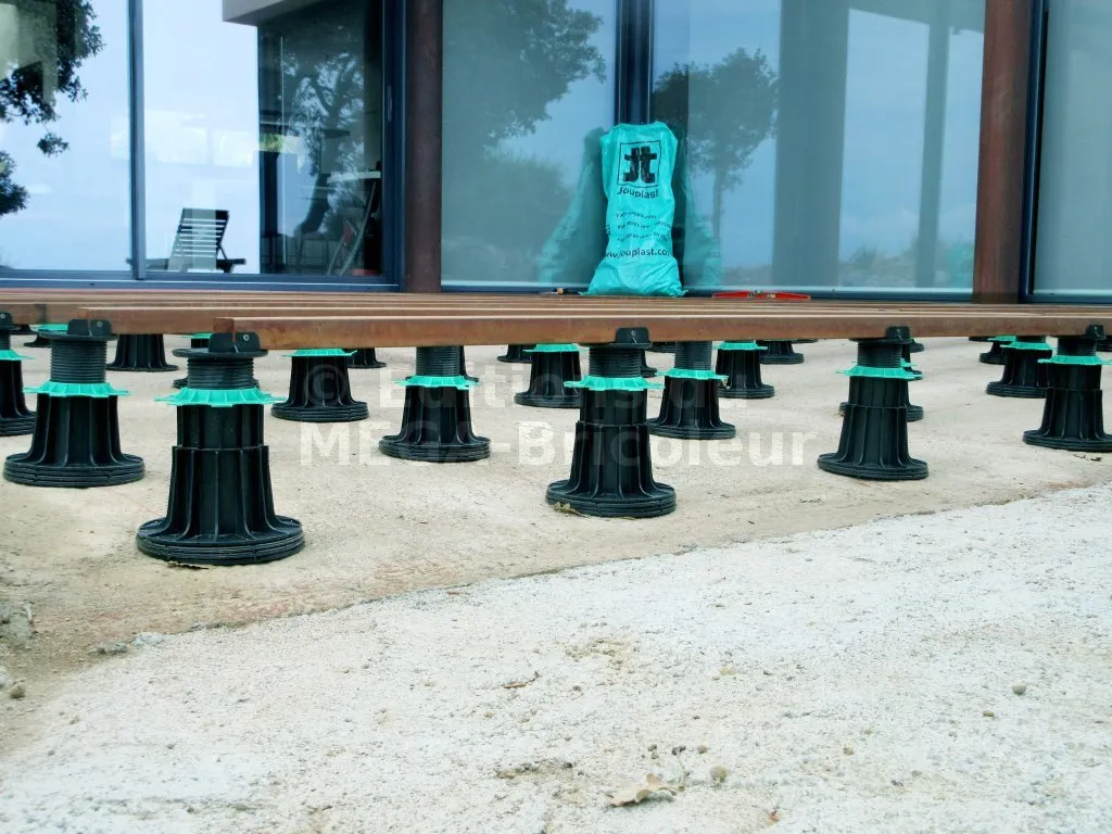- La structure de la terrasse posée sur plot doit être faite avec des lambourdes avec des matières bois ou métal et non composites.