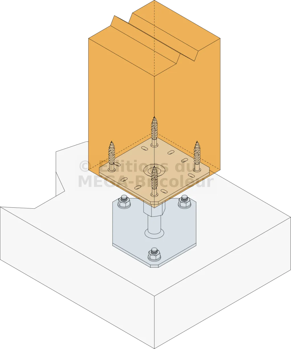 2. Fixer cette platine au poteau à l’aide de tirefonds LAG (pré-perçage nécessaire)