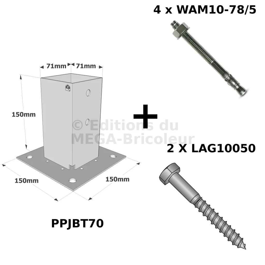 - 1 pied de poteau PPJBT70 ou PPJBT90 en acier galvanisé à chaud,