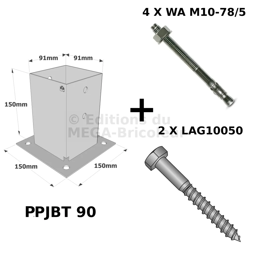 - 1 pied de poteau PPJBT70 ou PPJBT90 en acier galvanisé à chaud,
