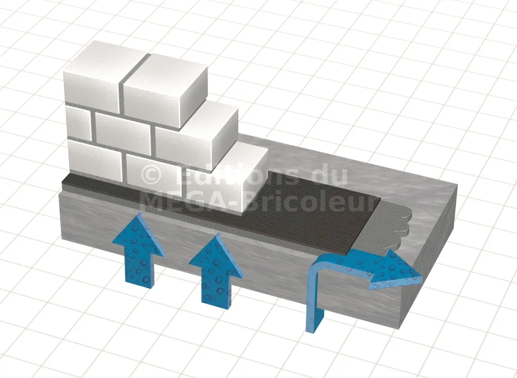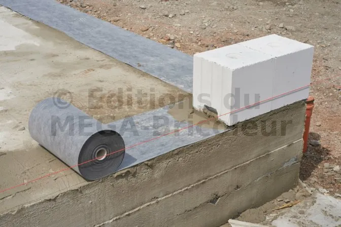 - Ouvrages en maçonnerie (DTU 20.1) : La bande DELTA®-PROTEKT est placée entre deux couches de mortier de ciment, à une hauteur d’au moins 15 cm au-dessus du niveau final du sol extérieur.