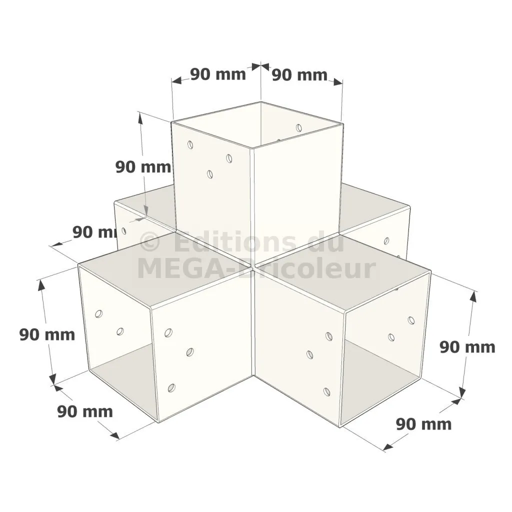 Il permet de raccorder deux poutres 90x90mm perpendiculairement à une autre poutre 90x90mm, le tout étant supporté par un poteau vertical de 90x90mm.