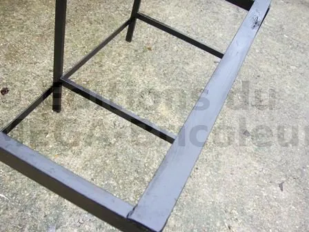 Les fers du bas, sont posés à chant contre les pieds des tréteaux et soudés. Ils sont perpendiculaires aux autres fers et garantissent ainsi une rigidité maximale au bâti.