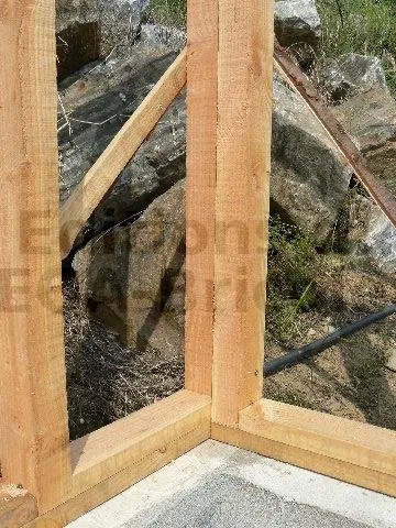 Il s’agit de la partie la plus délicate de l’ossature. L’ouverture large de l’abri étant située en coin, et n’ayant pu mettre un poteau de soutien dans ce coin parce que l’on veut une ouverture large sans obstacle, les lisses hautes à cet endroit sont en porte-à-faux.