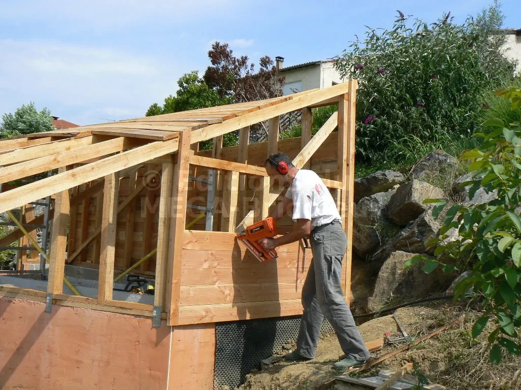 Les planches de bardage sont fixées contre les montants à la cloueuse pneumatique.