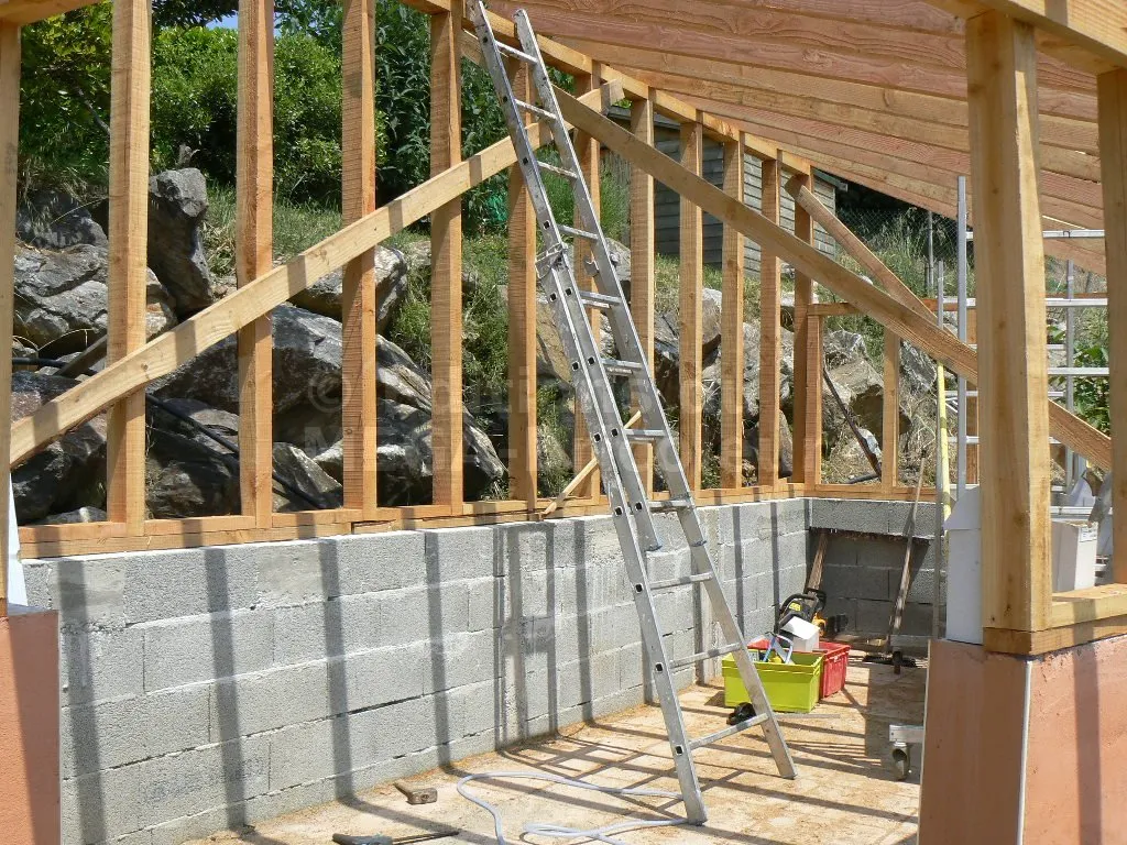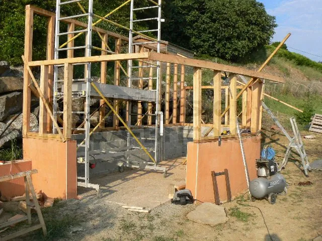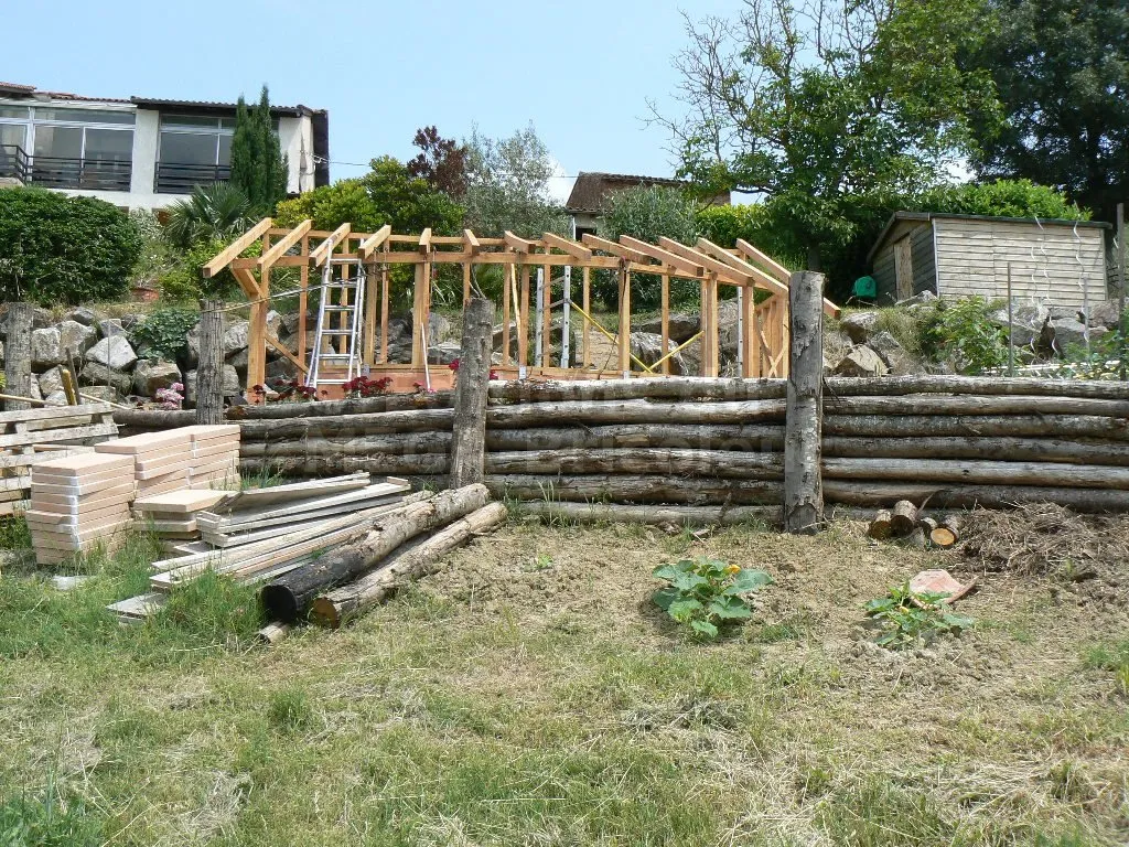 La section élevée et l’écartement rapproché des montants produisent une structure sur-dimensionnée pour un abri de jardin. Mais une partie des murs va recevoir des étagères ; les charges risquent d’être élevées. Vu le coût du bois en direct de la scierie, je n’ai pas hésité à sur-dimensionner.