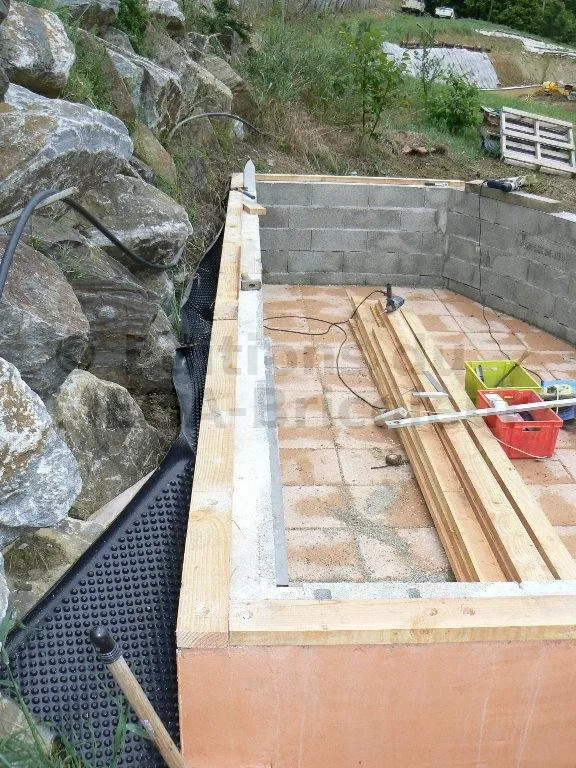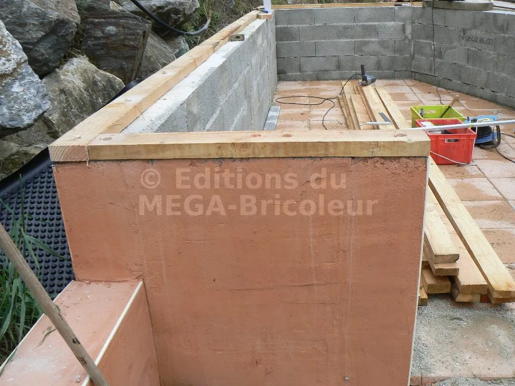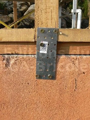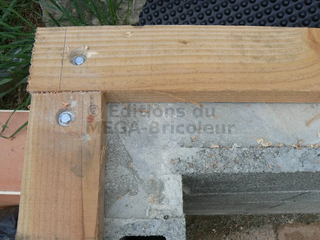 La lisse basse est fixée à la maçonnerie par des tire-fonds. La fixation sur certains parpaings creux s’avère parfois peu efficace. J’ai donc renforcé par des platines métalliques.