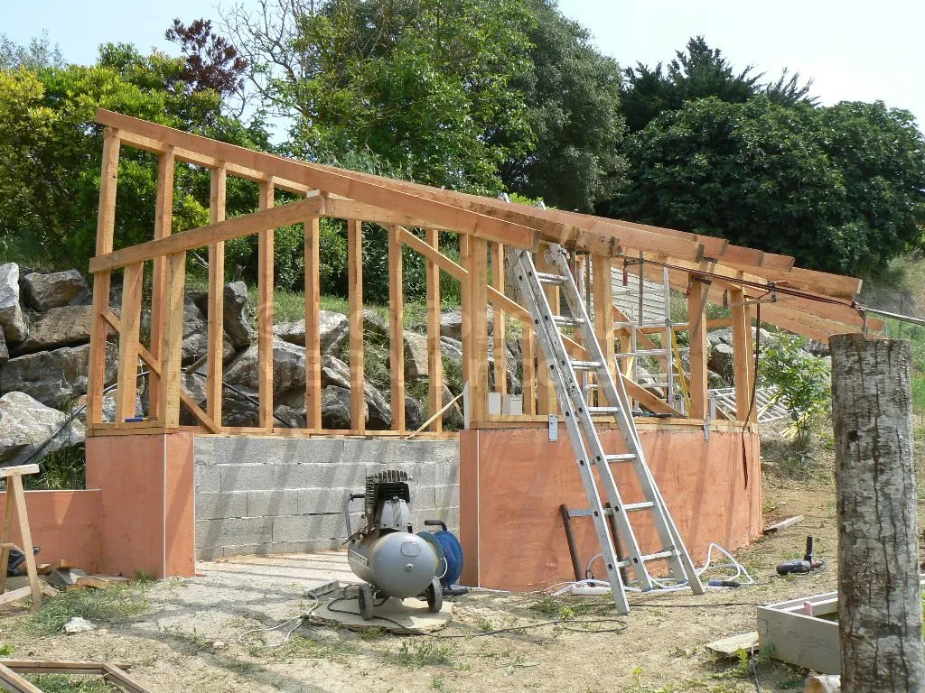 Le principe de l’ossature consiste en des montants reliés en parties supérieures et inférieures par des lisses. Le bardage épais utilisé, fixé sur les montants, assure une partie du contreventement de la structure. La toiture est chevronnée de façon classique. Les chevrons supportent un platelage qui contribue également à rigidifier la structure.