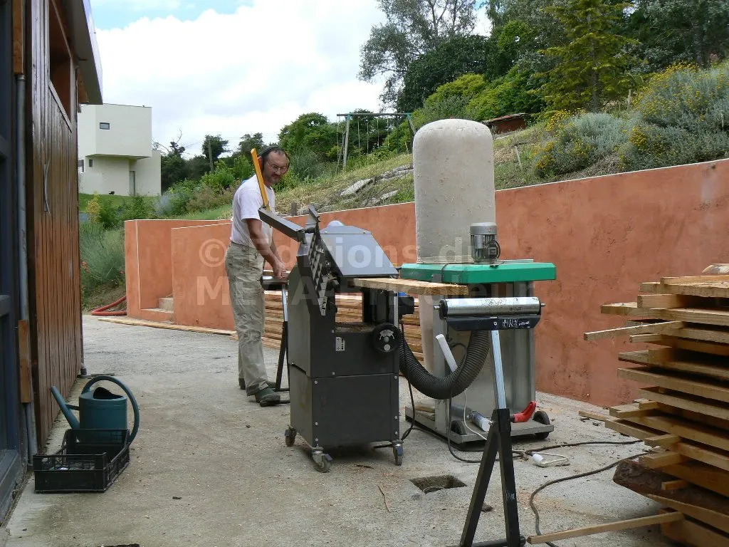 Le bardage est fait-maison à partir des planches de section 15x3. J’ai choisi une grande épaisseur de 30mm car le bardage va participer directement au contreventement. Les largeurs standards de 15 ou 19mm eu été insuffisantes.