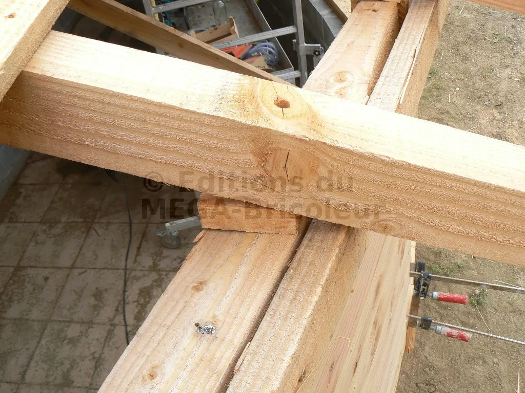 Les chevrons sont fixées aux lisses hautes par des grandes vis D6x140. il est nécessaire de pratiquer un trou de 14mm de quelques cm de façon à ce que la tête de vis pénètre un peu plus profondément dans le chevron.