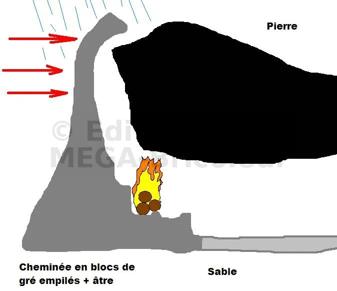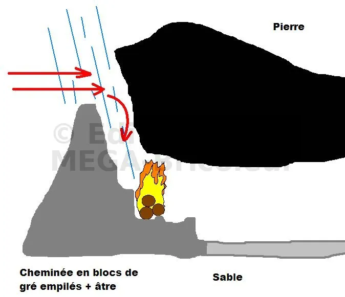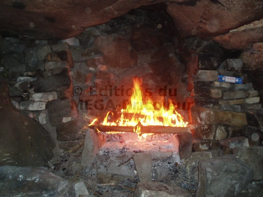 Mais le problème est double : d’une part la pluie tombe à l’intérieur s’il fait mauvais dehors et d’autre part, au moindre souffle de vent, toute la fumée rentre dans la grotte au lieu d’en sortir (sans cela, elle tire très bien).