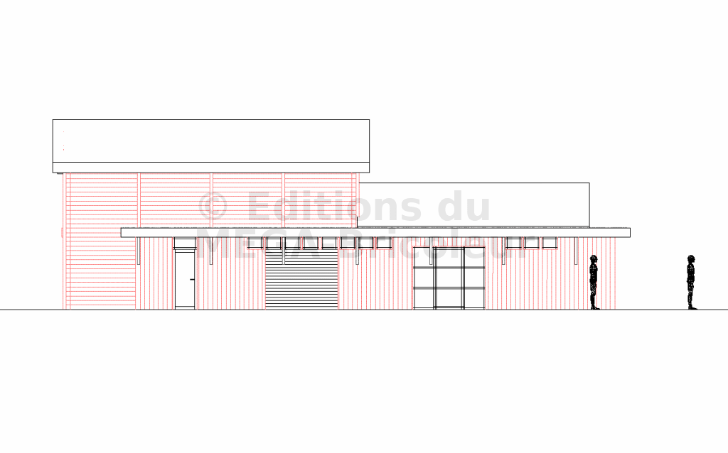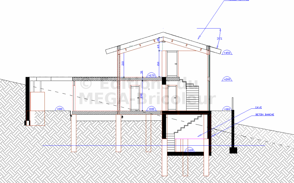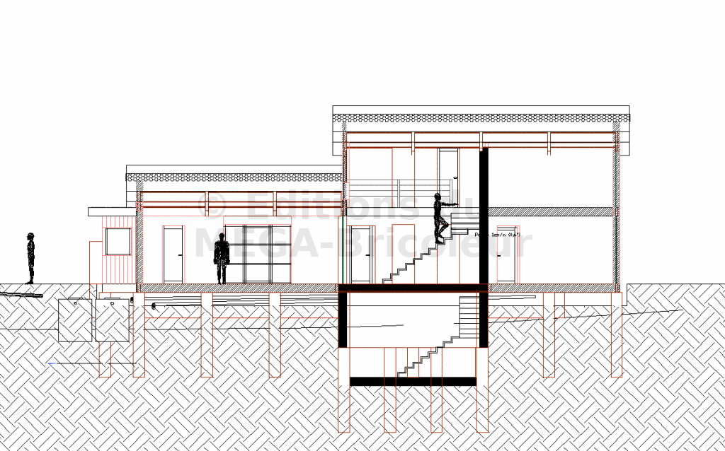 En respect avec les principes bioclimatiques, la construction est conçue selon 2 axes : un axe Ouest-Est correspondant à un volume JOUR à l’Ouest et un Volume NUIT à l’Est ; et un axe Nord-Sud correspondant à des pièces de services au Nord et des pièces d’agrément au Sud.