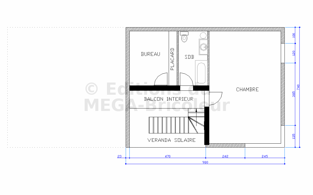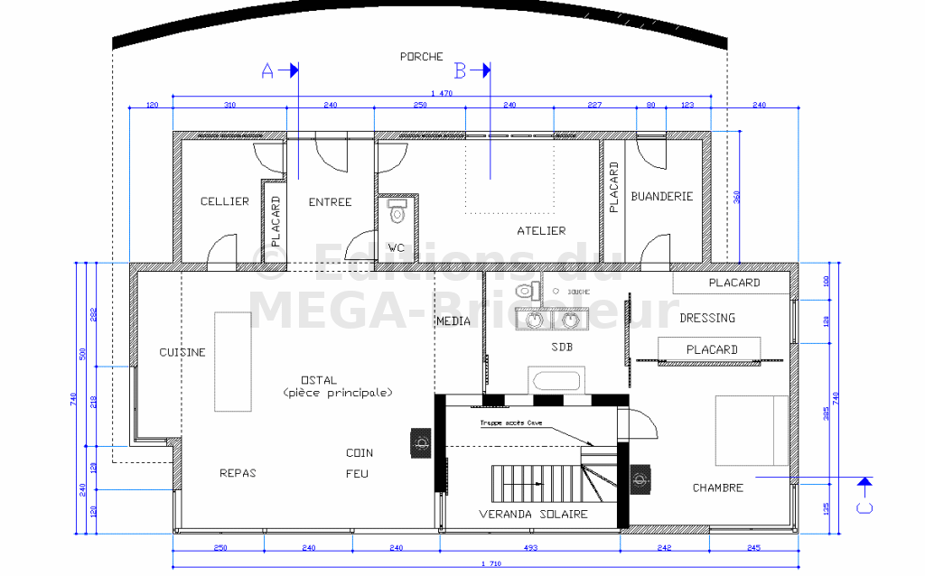 C’est le pivot central de la maison. Elle dessert le Séjour-Cuisine, l’étage et la suite des parents. De grandes baies vitrées permettent d’accéder à la terrasse. Le sous-sol de la véranda solaire correspond à la cave.