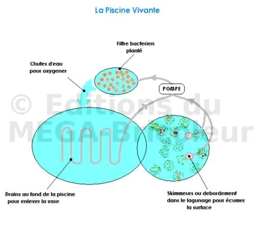 La piscine naturelle est le résultat d’un équilibre écologique entre des plantes et des micro-organismes présents dans le filtre. Les roches volcaniques du filtre retiennent les particules en suspension. Les micro-organismes opèrent une transformation chimique des particules filtrées dont le résultat est consommé par les plantes qui le transforment en biomasse. Le soleil aussi joue un rôle important par les UV agissant comme un stérilisateur. Une piscine naturelle est généralement constituée d’une chute d’eau ou d’un ruisseau qui a un rôle d’oxygénation.