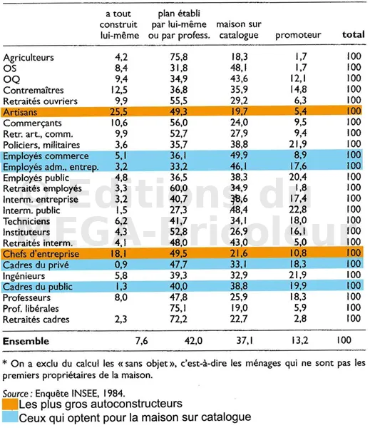 Contrairement aux Castors des années 50, ceux d’aujourd’hui ne sont plus uniquement des populations modestes. C’est parfois quasiment le contraire qui se passe. D’après une enquête de l’INSEE réalisée en 1984 sur le mode de construction de la maison par les nouveaux propriétaires, ce sont les artisans et les chefs d’entreprise qui sont les plus nombreux à construire eux même leur maison. Les premiers ont de l’expérience dans la construction, et les seconds ont les moyens et surtout du temps. Les moins nombreux sont les simples employés ou cadres qui optent le plus souvent pour les maisons sur catalogue. Les autoconstructeurs restent toutefois minoritaires (7,6%) par rapport à ceux qui choisissent la maison sur catalogue (37,1%). La grande majorité établit elle-même les plans ou engage un professionnel (42%) afin de concevoir un habitat adapté à leur besoin.