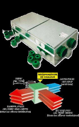 et un autre moteur qui aspire l’air neuf "frais" extérieur et le réinjecte "tiédi" dans les pièces de confort, les chambres, le séjour, le bureau.